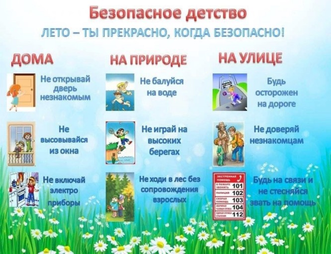 У ваших детей появилось больше свободного времени для приключений и ребяческих фантазий, а у вас – забот и тревог за их безопасность. Во время летних каникул детей подстерегает повышенная опасность на дорогах, у водоёмов, на игровых площадках, в садах, во дворах. Этому способствует погода, поездки и любопытство детей, наличие свободного времени и отсутствие должного контроля со стороны взрослых. Чтобы дети были отдохнувшими и здоровыми надо помнить ряд правил и условий при организации их отдыха с родителями, родственниками, друзьями: